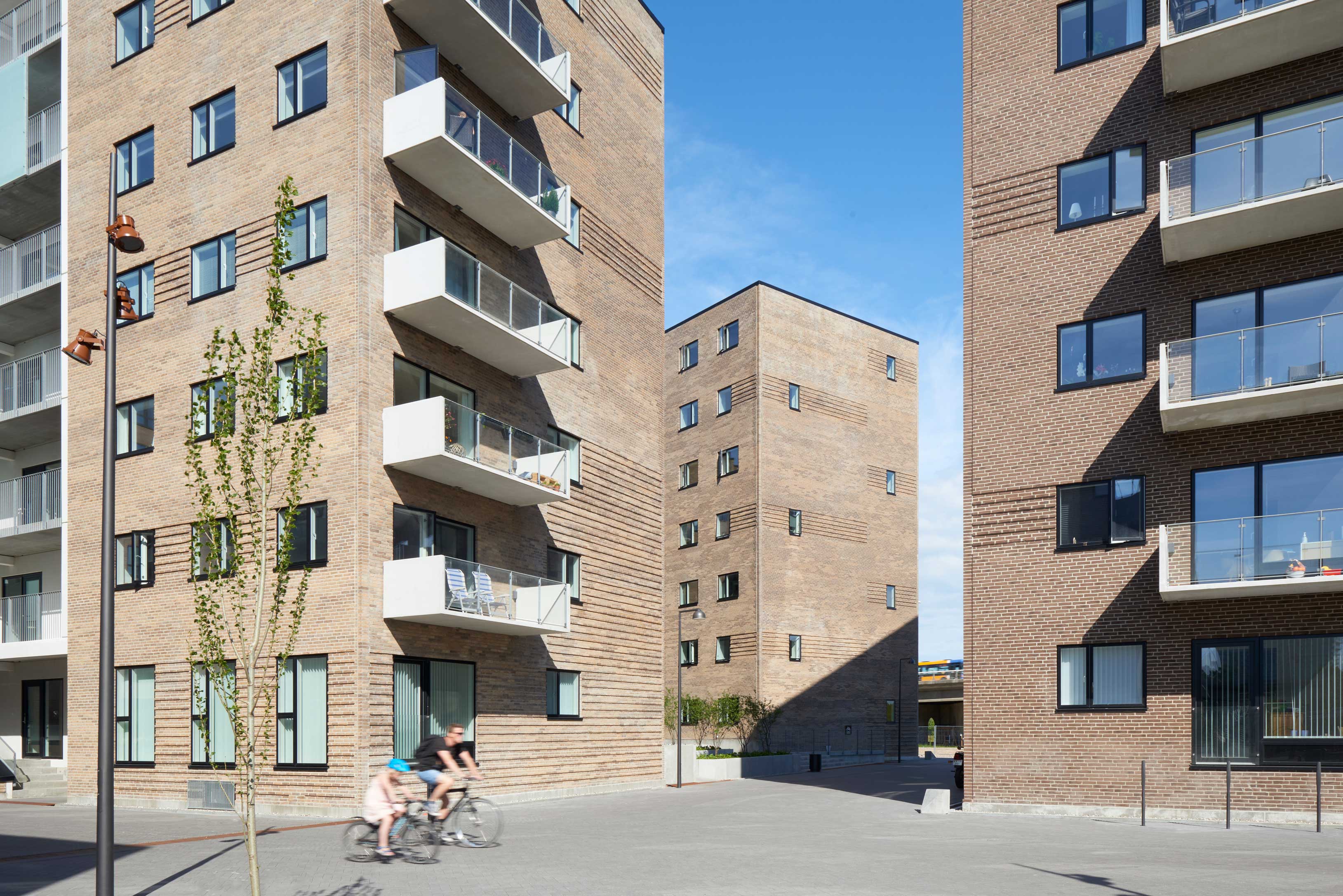 På facader og gavle etableres der tilbagetrækninger af felter i murværket i forbindelse med vinduespartier samt fremtræk af skiftegange, der giver facaden relief, variation og skyggevirkning. Disse arkitektoniske virkemidler skaber en detaljerigdom og en karakter, der understøtter byrummet og som differentierer den nederste base i forhold til de oven liggende etager. Facaderne brydes endvidere op af indgangene til ”hemmelige” haver, hvor beboere og forbipasserende inviteres indenfor via trapper og ramper, der leder op til de gemte haver og opholdsarealer i gårdrummene.