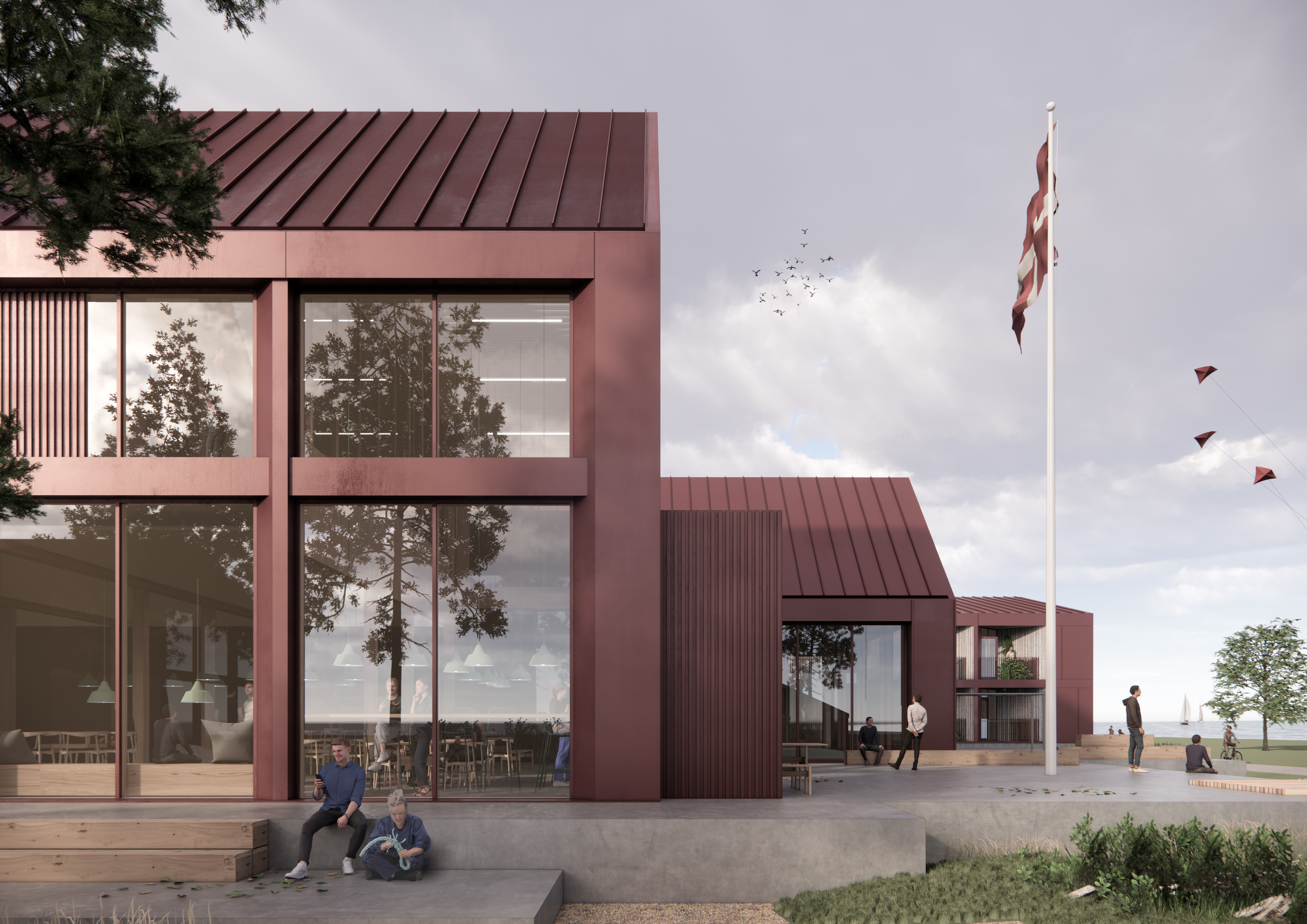 De nye røde længebygninger er placeret som bådhuse med store gavlene orienteret mod havet, hvorved de mellem husene skaber langstrakte forbindelser mellem land og hav. De markante tagformer taler godt ind i stedet og det maritime, og de nye gavle har tydelige referencer til kyststrækningens øvrige sømærker.